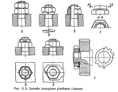 Запобігання самовідгвинчуванню різьбових деталей є важливим заходом у підвищенні надійності з'єднань деталей. У з'єднаннях деталей із кріпильними різьбами забезпечується самогальмування, оскільки кут тертя між витками різьби гвинта та гайки значно перевищує кут підйому гвинтової лінії. Крім цього, самовідгвинчуванню чинять опір сили тертя між деталями та опорними поверхнями гайки чи головки болта (гвинта). Але самогальмування різьбового з'єднання надійно реалізується тільки при статичному навантаженні. При дії змінних (вібраційних чи ударних) навантажень різко знижується коефіцієнт тертя між витками, умови самогальмування порушуються і спостерігається самовідгвинчування різьбових деталей, що може спричинити руйнування з'єднання або навіть аварійний стан у роботі машини. Щоб запобігти самовідгвинчуванню, слід використовувати стопорні пристрої, робота яких базується або на створенні додаткових сил тертя, або на використанні спеціальних замкових засобів. Пристрої, що базуються на створенні додаткового тертя, показані на рис. 11.5, а–г. Контргайка (рис. 11.5, а) створює додатковий натяг і додаткові сили тертя в різьбі. Пружинна шайба (рис. 11.5, б) підтримує натяг і додаткові сили тертя в різьбі на деякій ділянці самовідгвинчування (до 1–1,5 оберта гайки). Крім цього, пружність шайби значно зменшує вплив вібрації на тертя в різьбі. В гайках із завальцьованим