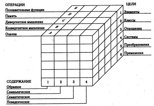 Интеллект (от лат. intelltctus – познание, понимание, рассудок), являясь важнейшей характеристикой человека, давно привлекает самое пристальное внимание и учёных, и других его носителей. Есть множество определений интеллекта. Интеллект – это: 1) мыслительная способность человека, его умственное начало; 2) совокупность всех умственных (познавательных) способностей человека; 3) способность правильно судить, понимать, размышлять и адаптироваться (приспосабливаться) к окружающей среде (напр. Бине, Саймон, 1905); 4) способность разумно действовать, рационально мыслить и хорошо справляться с жизненными обстоятельствами (Векслер, 1939); 5) способность к познанию и пониманию. Сегодня большинство психологов согласны именно с этим определением интеллекта, который рассматривается как способность адаптироваться к окружающей среде, к ситуации. В словаре иностранных слов интеллект определяется как ум, рассудок, разум; мыслительные способности человека. Аналогичное определение даётся и в словаре русого языка: интеллект – ум, мыслительная способность, умственное начало у человека. Интеллект – слово латинское, а ум – русское. Но они в своей основе схожи – и в том и в другом главным признаком является мыслительная способность человека. Ум – способность человека мыслить, решать задачи, это основа сознательной деятельности [Словарь Ожегова]. Тёрстоун в 1938 г. выделил семь таких способностей: 1) счётную способность, т. е. способность оперировать числами и выполнять арифметические действия; 2) способность к беглости речи, т. е. способность быстро подбирать нужные слова; 3) способность к вербальному восприятию, т. е. способность понимать значения слов; 4)способность к пространственной ориентации предметов и форм, или способность представлять различные предметы и формы в пространстве и оперировать ими в уме; 5) память – способность запоминать и воспроизводить информацию; 6) способность к логическому рассуждению – способность выводить закономерности; 7) способность к восприятию сходств или различий между предметами или изображениями, а также их деталей. Другие психологи выделили ещё больше факторов интеллекта. Например, Гилфорд (1959) выделил 120 факторов, по которым можно оценивать интеллект (рис.). 120 факторов получаются, если перемножить факторы, расположенные на осях х, у, z. Модель Дж.Гилфорда также является многофакторной. Однако в ней, в отличие от предыдущей, выделяется не семь, а 120 узкоспециализированных и независимых друг от друга познаватель-ных способностей. Гилфорд полагал, что эти способности зависят от трех основных параметров интеллектуальной деятельности: содержания (он выделил 4 типа содержания), характера интеллектуальных операций (5 типов операций) и ее целей (6 видов). В результате комбинирования этих трех параметров получается известная кубическая модель интеллекта Гилфорда, включающая 4 х 5 х б = 120 «единиц», т.е. специальных способностей (рис. 1).