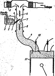 Рис. 7. 2. Схема найпростішого карбюратора. 1 – головний жиклер; 2 – поплавок; 3 – голчастий клапан; 4 – розпилювач; 5 – повітряний фільтр; 6 – повітряна заслінка; 7 – дифузор; 8 – дросельна заслінка; 9 – впускний трубопровід; 10 – впускний клапан; 11 – поршень.