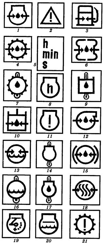 Рис. 11. 8. Символи контрольно – вимірювальних приладів і сигналізації: 1 – тиск оливи в двигуні; 2 – увага, аварійний стан; 3 – тиск палива в двигуні; 4 – тиск мастила в трансмісії; 5 – час: години, хвилини, секунди; 6 – тиск оливи в гідротрансформаторі; 7 – температура мастила в трансмісії; 8 – мотолічильник; 9 – тиск оливи в гідросистемі начіпного механізму; 10 - тиск мастила в гідросистемі начіпного механізму; 11 – аварійний стан двигуна; 12 – тиск оливи в турбокомпресорі; 13 – тиск охолоджувальної рідини; 14 – температура двигуна; 15 – тиск рідини в гальмівній системі; 16 – температура охолоджувальної рідини; 17 – температура мастила в двигуні; 18 – тиск повітря у пневмосистемі; 19 – тахоспідометр; 20 – рівень охолоджувальної рідини; 21 – аварійний стан трансмісії.