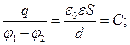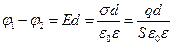 Розрахуємо ємність плоского конденсатора із площею пластин S, поверхневою густиною заряду σ, діелектричною проникністю ε діелектрика між пластинами, відстанню між пластинами d. Напруженість поля рівна