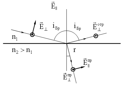 Таким образом, при выполнении условия Брюстера, отраженный свет будет полностью поляризован в плоскости, перпендикулярной плоскости падения. Это утверждение носит название закона Брюстера. Закон Брюстера имеет простое объяснение. Отраженная световая волна появляется за счет излучения электронов среды, совершающих вынужденные колебания под действием вектора