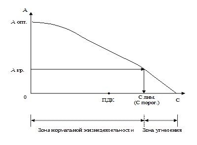 По горизонтальной оси графика отложена концентрация ядовитого загрязняющего вещества в окружающей среде. А - физиологическое состояние, жизненное состояние организма; например физиологические показатели ткани, органа, острота зрения и т.п. Оптимальным для организма является отсутствие ядовитого вещества в среде обитания и оптимум жизненной активности организма располагается на вертикальной оси ординат - (С > 0) имеет место снижение жизненной активности, но в области При C >> 0 состояние людей ухудшается, т.е. жизненная активность подавляется область: Обеспечить нулевое содержание тех или иных компонентов (агентов) загрязнения в среде обитания невозможно, но следует ограничивать их концентрации таких значений, которые не превышают Из сказанного понятно, что человеку жизненно важно находиться как можно меньше времени в среде, характеризуемой неравенством
