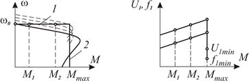Керуючими впливами Із багатьох систем автоматичного регулювання швидкості най-більш простою є система з додатним зв’язком за струмом, але діапа-зон регулювання її обмежений і не перевищує 10. Для збільшення діапазону регулювання вказану систему доповнюють зворотним зв’язком за швидкістю. Тоді при збільшенні навантаження збіль-шується сигнал розузгодження, що призводять до збільшення час-тоти та напруги і за умови застосування ПІ-регулятора швидкості механічна характеристика стає абсолютно жорстокою (лінія 1 на рис.11.7,а). При цьому напруга і частота пропорційно зростають, як показано на рис.11.7,б. При досягненні максимального моменту