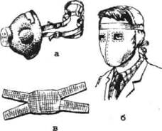Рис. 3.9 – Простіші засоби захисту органів дихання: а – респіратор Р-2; б – протипилова маска ПТМ-1; в – ватно-марлева пов’язка Індивідуальними засобами захисту шкіри є: захисні комплекти, спеці-альний захисний одяг, загальновійськовий комплексний захисний костюм, по-бутовий, виробничий і спортивний одяг. Вони за типом захисної дії поділяються на ізолюючі (плащі і костюми), матеріал яких покривається спеціальними газо-і вологонепроникними плівками, і фільтруючі, що являють собою костюми із зви-чайного матеріалу, який насичується спеціальним хімічним складом для нейтра-лізації або сорбції пару СДОР. Загальновійськовий захисний комплект ( ЗЗК ) складається із захисного плаща ОП-1 (виготовляють п’яти розмірів із спеціально прогумованої ткані), за-хисних панчох і захисних рукавичок. Маса комплекту 3 кг, упаковується в ящики по 20 шт. Загальновійськовий захисний комплект ( ЗЗК )