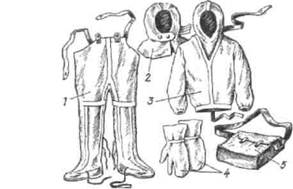 Рис. 3.11 – Легкий захисний костюм Л-1: 1 – штани з панчохами; 2 – підшоломник; 3 – сорочка з капюшоном; 4 – рукавиці; 5 – сумка Захисний костюм ( комбінезон ) складається з куртки і брюк (до комплекту входять і гумові рукавички, гумові чоботи й підшоломник). Виготовляють трьох розмірів із прогумованої ткані. Маса – 6 кг, упаковується в ящики по 20 шт. Захисний фільтруючий одяг ( ЗФО) складається з хлопчатопаперового ком-бінованого костюму, насиченого пастою К-4, гумових рукавичок, чобіт, підшолом-ника, двох онуч (одна насичена). Комплект захисного фільтруючого одягу