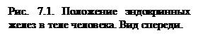 Управление процессами в организме обеспечивается не только нервной системой, но и эндокринными железами. К ним относятся специализированные, топографиески разобщенные железы (рис. 7.1), которые не имеют выводных протоков и выделяют свой секрет (который называется гормон) в кровь или лимфу.