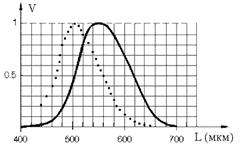 Рис. 0.2.2: Спектральная чувствительность глаза Суммарная кривая спектральной чувствительности глаза для случая яркого освещения, т.е. цветного зрения, показана на рис. 0.2.2 сплошной линией. Из этих графиков видно почему "ночью все кошки серы". В самом деле, например, отклик на красный цвет (l = 700 мкм) при низких уровнях освещения (точечная кривая на рис. 0.2.2) практически равен нулю. Поэтому красный цвет ночью будет выглядеть черным. В силу того, что коэффициент преломления в радужке и хрусталике растет с увеличением частоты света, глаз не избавлен от хроматической аберрации. Т.е. если изображение сфокусировано для одной из частот, то на других частотах изображение расфокусировано. Хрусталик оптимально фокусирует на сетчатке свет с длиной волны около 560 нм. Так как пики чувствительности средне- длинноволновых колбочек (530 и 560 нм, соответственно) близки к друг к другу, поэтому изображения для этих колбочек могут быть одновременно сфокусированными. Изображение же для коротковолновых палочек будет размытым. Так степень фокусировки разная, то не требуется одинаковой разрешающей способности глаза для разных типов колбочек. В глазу человека на одну коротковолновую колбочку приходится 20 средне- и 40 длинноволновых. В этой связи понятно, почему ширина полосы пропускания для "холодных", коротковолновых цветов в телевидении может быть выбрана существенно меньшей без субъективно заметной потери верности воспроизведения.