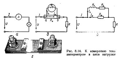 Вимір потужності ланцюга постійного струму. Потужність у ланцюзі постійного струму, як і в ланцюзі змінного струму з активним опором навантаження RH може бути визначена за допомогою амперметра і вольтметра за схемою на мал. 8.16, a чи б, оскільки Р = UI.