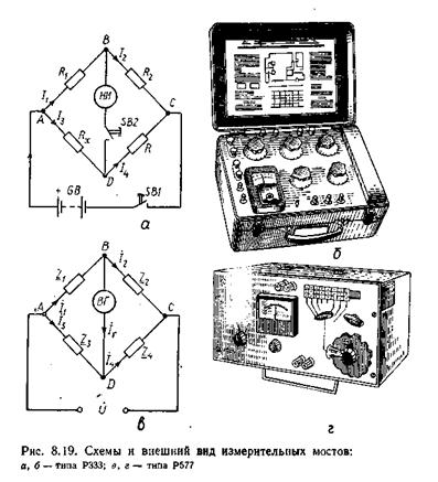 Мости змінного струму (рис.7, в и г) застосовуються в основному для виміру індуктивності і ємності. Як нульовий індикатор у них використовується вібраційний гальванометр ВГ чи осцилографічний індикатор.