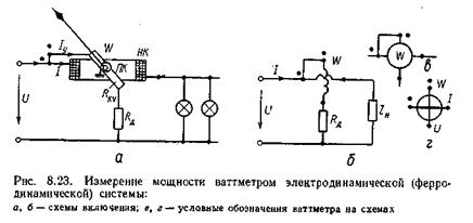 Для безпосереднього виміру потужності маються спеціальні стрілочні прилади – ваттметры електродинамічної, і ферродинамической систем, що включаються в ланцюг по схемах на мал. 8.23, a і б.