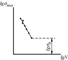 Обработка результатов испытаний состоит в построении кривой усталости (кривой Вёлера) в координатах максимальное напряжение s max – число циклов до разрушения N. Каждому разрушенному образцу соответствует точка на диаграмме. Если кривую усталости перестроить в двойных логарифмических координатах, то для углеродистых сталей и чугунов она будет представлена двумя прямыми линиями: