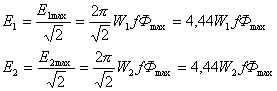 где Из последних формул видно, что ЭДС е1 и е2 отстают по фазе от потока Ф на угол p /2. Максимальное значение ЭДС: