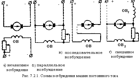 Возбуждение - это понятие, связанное с созданием основного магнитного поля машины. В машинах с электромагнитным возбуждением основное поле создается обмотками возбуждения. Имеются конструкции, в которых возбуждение создается постоянными магнитами, размещенными на статоре. Различают четыре схемы включения статорных обмоток: с независимым, параллельным, последовательным и смешанным возбуждением (рис. 7.2.1).