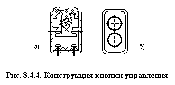 На изолированной плите 1 жестко укреплен неподвижный силовой контакт 2. На рычаге 3 шарнирно прикрепленном к плите имеется подвижный силовой контакт 4. Для управления силовыми контактами на плите смонтирована магнитная система, состоящая из сердечника 5 с катушкой 6 и якоря 7, прикрепленного к рычагу 3. Токоподвод к подвижному контакту осуществляется гибким проводником 8. При подключении к сети катушки 6 произойдет магнитное притяжение сердечником 5 якоря 7 и замыкание силовых контактов 2 и 4. Для разрыва силовой цепи отключают катушку 6, и якорь под собственным весом отпадает от сердечника. Помимо силовых контактов, в аппарате имеется ряд блокировочных 9, назначение которых будет показано ниже. Электрическая цепь катушки электромагнита является вспомогательной или управляющей. Для управления его применяются кнопки управления. Кнопки бывают одноцепные и двухцепные с замыкающими и размыкающими контактами. В большинстве случаев кнопки делаются с самовозвратом, т.е. при снятии механического давления их контакты возвращаются в исходное положение. На рис. 8.4.4 показана конструкция кнопки с двумя парами контактов: замыкающими и размыкающими.