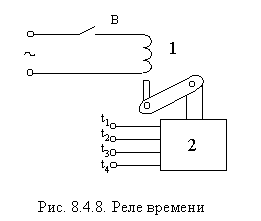 Нередко встречаются случаи, когда необходимо отключить электроустановку от сети, если уровень напряжения достиг, значения меньше допустимого. Для этой цели используется реле минимального напряжения. Его конструкция напоминает любое электромагнитное реле, но срабатывание здесь происходит при понижении намагниченности катушки и отпадания от нее якоря с контактной системой. Особое место в схемах защиты электрических установок занимает реле времени. Существуют как электромеханические, так и электронные реле времени. Рассмотрим конструкцию реле времени типа ЭВ (рис. 8.4.8.).