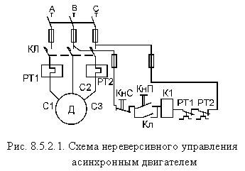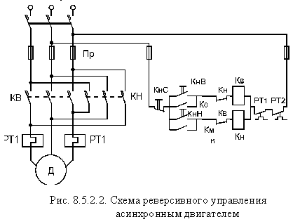 Для реверсивного управления двигателем применяется схема с двумя магнитными пускателями (рис. 8.5.2.2.).
