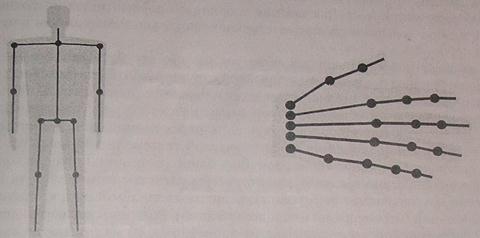 Рис. 8.18. Пример деформируемой полигональной сетки Сложность скелета определяется требуемым уровнем детализации изображаемого объекта. Например, при изображении человека, шагающего где-то вдали, достаточно показать основные движения рук и ног, в то время как для крупных планов, возможно, потребуется показать движения отдельных пальцев (рис. 8.19). Скелет состоит из костей (звеньев) и сочленений (на рис. 8.19 сочленения изображены кружочками). Каждая i -я кость описывается такими параметрами: длиной (li) и поворотами относительно родительской кости. Если поворот возможен только в одной плоскости, то говорят, что такое сочленение имеет одну вращательную степень свободы. Если повороты могут осуществляться в двух или трёх плоскостях, то это называют двумя или тремя степенями свободы. Заметим, что в теории манипуляторов кроме вращательных движений движений элементов шарнирных конструкций предусматривают также возможность изменения длины звена - это еще одна степень свободы. В качестве базового элемента для расчётов удобно использовать звено только с одной вращательной степенью свободы. В этом случае сочленение с несколькими вращательными степенями свободы представляется из нескольких сочленений звеньев нулевой длины. Таким образом, для описания каждой кости будем использовать один угол поворота (α i).
