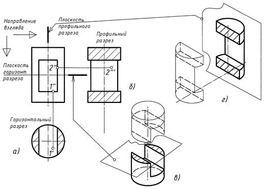Сквозное отверстие вырезает часть боковой поверхности цилиндра, поэтому очерк фигуры на профильной плоскости проекций изменяется, приобретая вид ломаной линии. Чтобы сделать видимыми внутренние поверхности цилиндра с прямоугольным сквозным отверстием, на рис. 2 выполнены два разреза: горизонтальной и вертикальной (профильной) плоскостями. Стрелками указано направление взгляда. На горизонтальном разрезе (рис. 2, а, в) стала полностью видимой нижняя горизонтальная плоскость сквозного отверстия. Точки 1' и 1" являются горизонтальной и фронтальной проекциями точки 1, лежащей на этой плоскости. Часть цилиндра, расположенную выше плоскости горизонтального разреза, мысленно удаляют. Заштрихована фигура, по которой плоскость разреза разделила удаленную и оставшуюся части цилиндра. На профильном разрезе (рис. 2, б, г) стала видимой правая боковая плоскость отверстия. Точки 2" и 2''' являются фронтальной и профильной проекциями точки 2, принадлежащей этой плоскости. Половину цилиндра, расположенную перед плоскостью профильного разреза, мысленно удаляют. На профильном разрезе заштрихованы прямоугольники, по которым произошло разделение удаленной и оставшейся частей цилиндра. Оба разреза построены независимо друг от друга как для целого цилиндра.