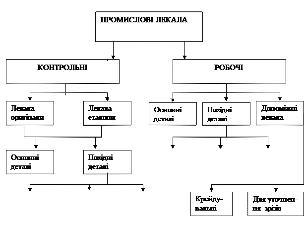 Розробка промислових лекал деталей одягу є кінцевим етапом проектування швейних виробів. Особливістю розробки промислових лекал деталей одягу є те, що навіть для однотипних моделей, але для різних технологічних потоків, можливі різні конструктивно-технологічні рішення виробів. При розробці лекал деталей необхідно враховувати чинники, що забезпечують точність і надійність конструкції. До них можна віднести: властивості матеріалів, конфігурація і розміщення ліній членування деталей та інше. Від рівня виконання промислових лекал залежить якість виробу, що проектується, показники його технологічності та економічності. Наприклад, від конфігурації зрізів деталей, їх спряженості залежать витрати часу на виконання з’єднувальних швів, процент міжлекальних випадів. Лекала різняться між собою за видом, призначенням, інформативністю і поділяються на певні групи відповідно до класифікації (рис.5). За призначенням лекала поділяються на контрольні (еталони) та робочі. За видом деталей, з яких складається конструкція одягу, розробляються лекала на основні та похідні деталі. За видом матеріалів, з яких виготовляються деталі одягу, лекала поділяються на лекала деталей з основних, підкладочних та прокладочних матеріалів. Окрему групу складають допоміжні лекала, які розробляються на основі контрольних лекал і використовуються на певному робочому місці для виконання допоміжних операцій.