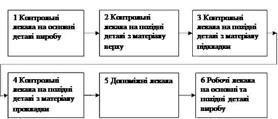 Рис.5. Класифікація промислових лекал Лекала-оригінали – відповідають зразку моделі виробу базового розміру і містять усі необхідні відомості щодо деталей, конфігурації, розміру, матеріалів, методів обробки. Лекала-еталони – розробляються на основі лекал-оригіналів шляхом градації на усі розміри і зрости, що рекомендовані для виготовлення виробу. Робочі лекала – розробляють на основі лекал-еталонів, вони призначені для використання при розкрої, при встановленні норм витрат матеріалів, перевірці якості крою та виготовленні виробів на певному робочому місці. Допоміжні лекала – розробляють за лекалами-еталонами, вони використовуються при розкрої та виготовленні виробів для нанесення допоміжних ліній і уточнення зрізів деталей. Відповідно до ДСТУ ЄСКД виконуються робочі креслення деталей одягу або лекала з технічного картону за ГОСТ 8273-75. Вихідними даними для розробки креслень деталей одягу або лекал є наступна інформація. 1. Відомості про виріб (технічний рисунок, зразок моделі, скорочений технічний опис на модель). 2. Остаточне креслення деталей конструкції виробу або комплект остаточних лекал на модель. 3. Відомості про властивості матеріалів (деформації параметрів тканини під час волого-теплової обробки, осипання, товщина, здатність до технологічних деформацій посадки і розтягування). 4. Відомості щодо методів обробки і технологічного обладнання. 5. Відомості про організаційні форми технологічного потоку. При розробці контрольних лекал необхідно враховувати властивості матеріалів: усадку, товщину, осипання, здатність до технологічних деформацій. Під усадкою матеріалів розуміють властивості матеріалів змінювати лінійні розміри в процесі технологічної і волого-теплової обробки. Величина усадки надається в процентах в напрямі нитки основи і утоку відповідно до групи матеріалів. Товщина і осипання матеріалів впливають на вибір методів обробки виробу і визначають величини технологічних припусків в лекалах. Здатність матеріалів до технологічних деформацій зумовлює можливість створення об’ємної форми виробу. При застосуванні сучасних методів технологічної обробки виробів передбачають два види деформації по зрізах деталей: розтягування та зпрасування. Наприклад: по ліктьовому зрізу двошовного рукава виконується зпрасування, а по передньому – розтягування. При розробці лекал необхідно враховувати відомості про методи технологічної обробки, види технологічного обладнання і організаційні форми виробництва, які визначають вид і конструкцію швів, величини технологічних припусків, впливають на конструкцію деяких деталей. Розробка промислових лекал виконується в певній послідовності (рис.6):