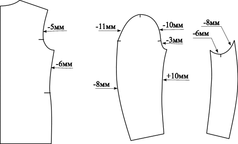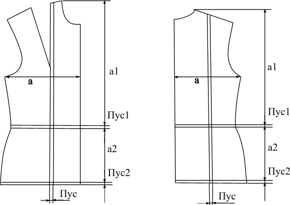 Рис.8. Схема розсуву лекал деталей переду і спинки для виробів прилеглої силуетної форми Третім етапом побудови лекал-оригіналів на основні деталі є визначення величин технологічних припусків по зрізах деталей. Величина технічних припусків по зовнішніх контурах деталей залежить від конструкції шва, осипанню тканини, конфігурації зрізу, необхідності підрізки деталей тощо. Конструкція шва та величина припуску на з’єднання деталей визначається відповідно «ДСТУ ISO 4916:2005 Матеріали текстильні. Типи швів. Класифікація і термінологія». В нормативних документах вказуються величини припусків на шви у вигляді рекомендованих значень, наприклад: на з’єднання деталей пілочки, спинки та рукава зі станом величина припуску складає 10,0 – 15,0мм. Необхідно обирати величини припусків на шви єдині для певного технологічного процесу. Величина припуску на шов також залежить від характеру кривизни зрізів деталей. На зрізах з малим радіусом кривизни (горловини, пройми) величина припуску на шов не повинна перевищувати 10,0мм, інакше збільшиться різниця між довжиною зрізу та довжиною шва. До зовнішніх контурів лекал можуть бути передбачені припуски на підрізку деталей у тих випадках, якщо конфігурація і розміри деталей можуть змінюватися під час виконання волого-теплової обробки або технологічних операцій і при цьому вимагається підвищена точність з’єднання. Але наявність припусків на підрізку по зрізах деталей збільшує витрати тканини та підвищує трудомісткість виготовлення виробу. Для покращення технологічності конструкції надається перевага конструктивним методам отримання необхідної форми основних деталей із застосуванням виточок і швів. Види технологічних припусків: · Пш –на шов [17]; · Пк – на кант (0,1-0,2см); · Птм – на товщину матеріалу (0,2-0,8см); · По – на огинання (0,4-0,5см); · Пос – на осипання (0,2см); · Ппідр – на підрізку деталей (0,2-0,5см); · Ппідг – на підгин зрізів (0,5-5,0см). Технологічні припуски враховують при зміні розмірів деталей у певній послідовності. Припуски поділяють на внутрішні, що не змінюють розмір деталей у готовому вигляді, та зовнішні, що використовують для з’єднання та уточнення розмірів деталей. Спочатку збільшують розміри шаблонів деталей на величини внутрішніх припусків, визначають лінію готового виду, а потім додають зовнішні припуски і оформлюють край деталі (табл.7). Таблиця 7 Види технологічних припусків