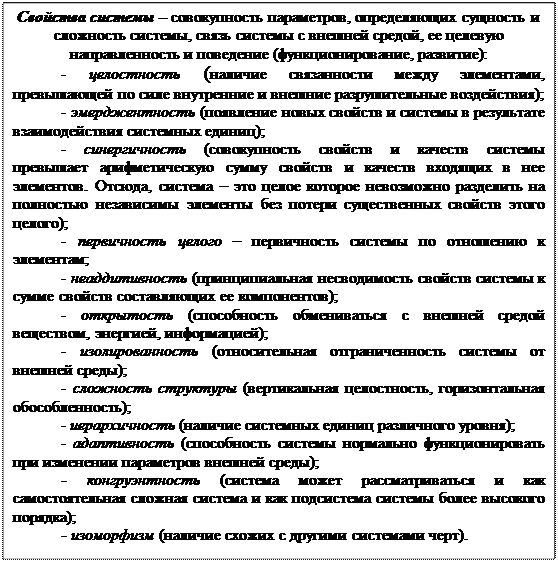 В системном подходе обращается на свойства, которые появляются у объектов любой природы, когда их части, элементы, компоненты взаимодействуют между собой. Применительно к исследованию организации системный подход предусматривает: - рассмотрение организации как некой целостности, состоящей из взаимодействующих элементов, то есть определенное упорядочение системных единиц и связей между ними; - всестороннее изучение признаков и свойств системных единиц, связей и отношений, которые возникают между ними; внимание к условиям и факторам, влияющих на их взаимодействие (для социальных организаций – человек, целевые ориентиры); - выявление новых свойств и качеств, которые возникают в процессе взаимодействия и оказывают влияние на входящие в систему компоненты, на ее внутреннюю и внешнюю среду; - изучение всей совокупности параметров и показателей функционирования системы в динамике. Системный подход и системная методология не конструируют и не создают методы исследования. В рамках системного подхода максимально точно формулируются задачи, которые необходимо решить и определяется каким условиям и требованиям должны отвечать методы, применении которых приведет к решению задачи. К таким методам можно отнести системный анализ и синтез, структурно-функционального анализ, методы общей теории систем, системотехники, исследования операций и др.[26]