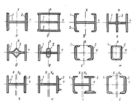 Найпростішим методом підсилення сталевих стояків є нарощування поперечного перерізу їх за допомогою наварювання додаткових металевих прокатних елементів різного профілю. Варіантів підсилення може бути багато (рис. 6.5) залежно від ряду факторів: необхідної площі елементів підсилення; зручності виконання робіт; наявності матеріалів для підсилення тощо. Перед підсиленням таким методом конструкція повинна бути максимально розвантажена (на момент підсилення на конструкцію має діяти не більше ніж 50...60% повного навантаження). Шви, якими приварюються елементи підсилення, виконують переривчастими. Послідовність їх накладання в кожному конкретному випадку визначається таким чином, щоб температурні деформації, котрі виникають при зварюванні, не призвели до загального деформування конструкції. Не допускається використання зварних швів, які мають напрям, перпендикулярний дії поздовжньої сили, тобто перпендикулярно поздовжній осі стиснутих елементів.