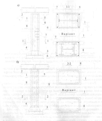 Рис. 6.8. Обетонування сталевих колон: а — суцільних; б — наскрізних: 1 — колона, що підсилюється; 2 — балки перекриття; 3 — фундамент; 4 — - база колони; 5 — оголовок колони; 6 — поздовжня арматура підсилення; 7 — поперечна арматура; 8 — бетон