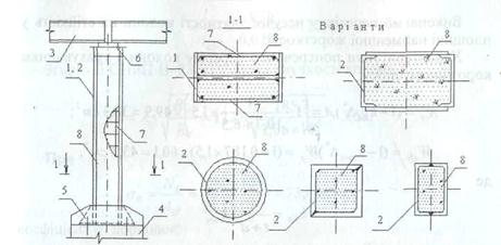 Рис. 6.9. Бетонування порожнин колон: 1 — колона, що підсилюється, відкритого профілю; 2 — те ж замкнутого профілю; 3 — балка перекриття; 4 — фундамент; 5— база колони; 6— оголовок колони; 7— П-подібні каркаси, приварені до колони; 8 — бетон