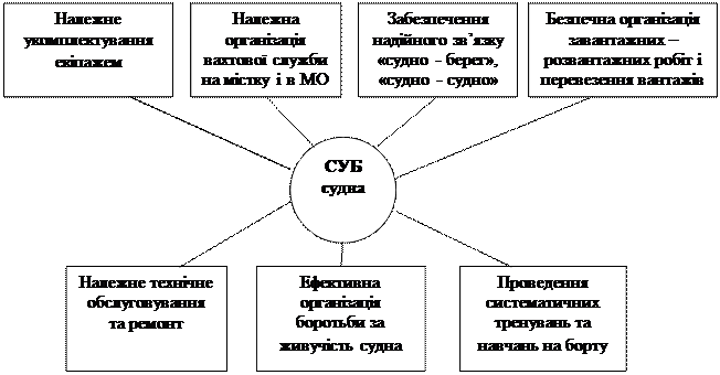 Де: ОУ – об’єкти управління; на вході – політика і документи компанії з безпечної експлуатації судна; на виході – показники що характеризують стан судна по відношенню безпеки (Safety); ЗВ – збурювальні впливи природного, техногенного, комерційного, політичного, економічного характеру, які впливають на безпеку; КУ - команди управління екіпажем, які реалізуються через відповідні технічні пристрої, програми, плани та процедури; ЗЗ – зворотний зв’язок, що дозволяє на судні робити висновки про ефективність управління безпекою (акти перевірок, аналіз аварій). Важливо підкреслити, що СУБ судна є саморегульованою системою за рахунок діяльності екіпажу, спрямованої на підтримку постійної готовності до протидій небезпеці та ефективним діям з боротьби за живучість судна в надзвичайних ситуаціях. Це саморегулювання забезпечується постійною роботою офіцера з безпеки («Safety officer») і періодичним аналізом стану безпеки та реалізації відповідних заходів на засіданнях Комітету з безпеки, тобто на основі інформації, отриманої по лінії зворотного зв’язку, виявляються та оперативно усуваються недоліки та невідповідності як внутрішнього характеру (збої в роботі окремих елементів і підсистем судна), так і обумовлені зовнішніми впливами (ЗВ). СУБ судна основана на двох основних принципах: а) ставиться вимога виконання всіх діючих міжнародних документів з безпеки та захисту середовища: СОЛАС, МППСС, ПДНВ – 95, МАРПОЛ, «Про вантажну марку», Конвенції МОП № 147, а зараз ще й нового Міжнародного кодексу – ISPS Code; б) основні елементи системи запозичені з розроблених раніше систем управління якістю. До елементів СУБ, окрім організаційної структури, відноситься також персонал і ресурси, що знаходяться у розпорядженні керівництва. До МКУБ належать такі міжнародні документи конвенції ІМО: СОЛАС – 74, МАРПОЛ – 73/78, ПДНВ – 78/95; резолюції ІМО: А.739 (18), А.740 (18), А.741 (18), А.742 (18), А.787 (19), А.788 (19), А.789 (19); конвенція № 147 1976 р. Міжнародної організації праці (МОП). На Асамблеї ІМО 4 листопада 1993 р. ухвалені резолюції, що віднесені до МКУБ: а) р езолюція А.739 (18) – керівництво з призначення організацій, які діють від імені Адміністрації – встановлює правила, яким повинна задовольняти організація, уповноважена Адміністрацією прапору виконувати роботи і видавати освідчення від її імені; б) р езолюція А.740 (18) – містить керівництво з надання допомоги державам прапору судна з виконання мір безпеки на морі і захисту морського навколишнього середовища; в) резолюція А.741 (18) – містить МКУБ; кодекс встановлює правила, котрим повинна відповідати СУБ компанії стосовно як компанії, так і судна; б) р езолюція А.742 (18) – встановлює процедури контролю за експлуатаційними вимогами стосовно безпеки суден і попередженню забруднення, обумовлює обов’язок держави прапора силами контролю держави порту проводити інспекції суден з метою перевірки дійсності всіх свідоцтв і документів стосовно судна та екіпажу. Основний зміст резолюцій ІМО, ухвалених на 19 –й Асамблеї ІМО: а) р езолюція А.787 (19) – встановлює правила та керівництва з контролю і затриманню суден Адміністраціями держави порту; б) р езолюція А.788 (19) – ухвалює Керівництво із застосування МКУБ Адміністраціями прапору. Вона встановлює порядок проведення оцінювання, сертифікації і контролю СУБ в компанії та на судні, також терміни дії документ
