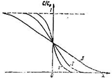 Рис. 4.5. Концентрационные кривые диффузии из одного полуограниченного образца в другой: 1 – при t1; 2 – при t2; 3 – при t3 (t3 > t2 > t1)