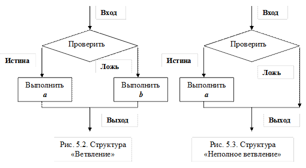 Эти прямоугольники могут представлять как одну единственную команду, так и множество операторов, необходимых для выполнения сложной обработки данных. Ветвление - это структура, обеспечивающая выбор между двумя альтернативами. Выполняется проверка, а затем выбирается один из путей (рис. 5.2). Эта структура называется также «ЕСЛИ - ТО - ИНАЧЕ», или «развилка». Каждый из путей (ТО или ИНАЧЕ) ведет к общей точке слияния, так что выполнение программы продолжается независимо от того, какой путь был выбран. Может оказаться, что для одного из результатов проверки ничего предпринимать не надо. В этом случае можно применять только один обрабатывающий блок (рис. 5.3).