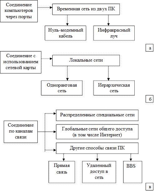 Рис. 1. Способы соединения компьютеров и виды сетей: а - временная сеть; б - локальные сети; в - сети, организованные с помощью каналов связи.