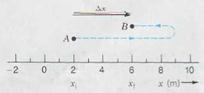 ∆ x = x f − x i (2.1) Displacement is a vector quantity which refers to "how far out of place an object is"; it is the object's change in position. The Greek letter ∆ (capital delta) is usually used to signify the change in the variable that follows it. Note that ∆ x always means the final value minus the initial value, not the greater minus the lesser. The sign of ∆ x indicates its direction relative to the + x axis. In Fig. 2.1 the particle starts at point A (x i = 2 m) and stops at point В (x f = 6 m), having turned around at x = 9 m. Its displacement, ∆ х = 6 − 2 = +4 m, depends only on the initial and final positions, not on the details of the journey. The distance traveled − that is, the length of the actual path — is a positive scalar which refers to "how much ground an object has covered" during its motion. Its value for the journey in Fig. 2.1 is 10 m. In general, the distance traveled between two points is not equal to the magnitude of the displacement between the same two points. A basic question regarding the motion of a particle is how fast it moves. The average speed for a finite time interval is defined as Average speed = Distance traveled / Time interval (2.2) Since it is defined in terms of distance, average speed is also a positive scalar. (We will not use a symbol for average speed.) In contrast, the average velocity for a finite time interval is defined as Average velocity = Displacement / Time interval Average velocity is a vector in the direction of the displacement. The average velocity depends only on the net displacement and the time interval; the details of the journey in between are of no consequence. Since we are concerned only with motion along the x axis, the x component of the average velocity is