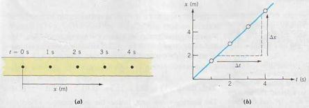 where ∆ t = t f – t i. The SI unit of both speed and velocity is m/s. The sign of υ av is the same as that of the displacement. Positive υav means that the net motion is in the direction of the + x axis. For the motion depicted in Fig. 2.1, suppose it took 4 s to go from A to B. The average speed would be (10 m)/(4 s) = 2.5 m/s, whereas the average velocity would be υav = (+4 m)/(4 s) = +1 m/s. The motion of a particle is often presented in graphical form. The features of the graph allow us to quickly extract information on the history of the particle's motion. If the position of a particle moving at constant velocity were recorded on a paper tape, at 1 s intervals, say, the dots would be equally spaced as in Fig. 2.2 a. The corresponding x versus t graph (Fig.2.2 b) is a straight line. Since υ av = ∆x/∆t, we see that the average velocity is given by the slope of the x versus t graph. When the motion is not at constant velocity, the graph of x versus t might look like Fig. 2.3. In general, the x component of the average velocity for any time interval ∆ t is given by the slope of the line joining the initial and final points on the x versus t graph.