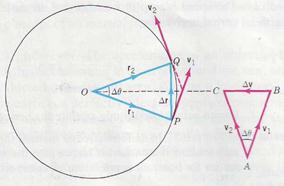 Figure 2.12 shows a particle moving at constant speed υ in a circle of radius r. Suppose that in a short time interval ∆t its position vector rotates through the angle ∆θ and the particle's displacement, ∆ r = r 2 – r 1 is vertical. Since v is always perpendicular to r, these two vectors change their directions by the