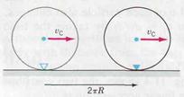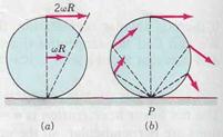 A common example of rotation is that of a ball or wheel rolling on a surface. Figure 2.16 shows a wheel of radius R rolling without slipping. In one revolution it covers a distance equal to its circumference and takes a time equal to one period T. Thus, the speed of the center is υ c = (2π R)/ T=ωR, where ω is the angular velocity of the wheel. From Eq.11.5 this is equal to the tangential speed υt of a point on the rim relative to the center: υс = υt = ω R (2.28) Rolling is a combination of translation of the center and rotation about the center. The velocity of any point on the rim is the vector sum v = v c + v t. At the top of the wheel these two velocities are in the same direction, so υ = 2ω R, as shown in Fig. 2.17 a. At the bottom, they are in opposite directions, so υ = 0. Since the wheel does not slip, the point of contact with the surface is instantaneously at rest and the wheel momentarily rotates about this point: The particles appear to describe circular paths with angular velocity ω about P as the center, as indicated in Fig. 2.17 b.