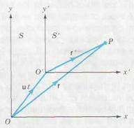 r ' = r − u t (3.4) This vector equation is equivalent to three equations in terms of the components. An often encountered special case occurs when the x and x' axes coincide and frame S' moves at constant velocity + u i along the x axis of S, as shown in Fig. 3.4. The у and z coordinates of P are the same for both coordinate systems. The figure shows that x' = x − ut. Therefore, for this special case, x' = x − ut, y'=y, z'=z, t'=t. (3.5)