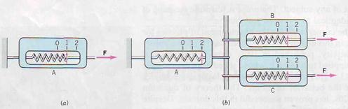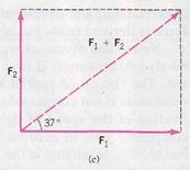 In order to measure and compare forces, we may use the expansion of a "standard" spring A, shown in Fig. 3.6 a. We might define a force of one unit as the action that extends the spring by one unit of length. To measure larger forces, spring A must be calibrated. We take springs В and С and apply the same force (one unit) to each. By the simple method depicted in Fig. 3.6 b, a force of two units is applied to A, and so a "2" can be marked on the scale. This procedure is easily repeated for larger forces. Force is clearly a quantity that has both magnitude and direction. But before one can call it a vector, one must verify that it obeys the law of vector addition. Figure 3.6 c shows a force F1 of 4 units directed due east and a force F2 of 3 units directed due north. Experiment shows that the combined effect of these two forces is the same as that of a force of 5 units in the direction 37° N of E. This is simply the magnitude and direction of the vector sum of these two forces, which confirms the vector nature of force.