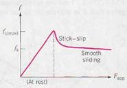 It is common experience that it takes a certain minimum force to start an object sliding over a surface. Once the sliding has started, the force needed to keep it moving at constant velocity is lower. In 1748 Leonhard Euler distinguished between static friction and kinetic friction. In Fig. 3.11 a force is applied to a block on a horizontal surface. The force of static friction opposes the tendency of the block to move relative to the surface. If the block does not move, the force of static friction f s must be exactly equal to the applied force F app. As the applied force is increased, f s also increases and stays equal to F app, as shown in Fig. 3.12, but only until a critical value, f s(max), is reached. For a larger applied force, the block starts to slide and is then subject to kinetic friction. As sliding commences, the frictional force rapidly falls at low speeds. At higher speeds, the force of kinetic friction f k either stays constant or decreases gradually as the speed increases. In many cases the friction at low speeds is characterized by a combination of static and kinetic friction. This produces a jerky "stick-slip" motion that can often be heard in creaking doors or planks, tire squeal, and squeaky wheels. The fact that the frictional force is proportional to the load allows us to define two coefficients of friction. The force of kinetic friction f k may be related to the normal force between the sliding surfaces by the equation f k= μ k N (3.15) where μ k, the coefficient of kinetic friction, is a dimensionless number. Notice that Eq.6.1 is not a vector equation. As was mentioned above, the force of static friction does not have a fixed value. However, its maximum value is simply related to the normal force: f (max)= μ s N or f s ≤ μ s N (3.16) where μ s is the coefficient of static friction. Make a careful note of the difference in form between Eqs. 3.15 and 3.16. In general, μ s > μ k, but there are exceptions. The above relations are not exactly true. The coefficients are not really constants for any pair of surfaces; they depend on roughness, cleanliness (grease or oxide films), temperature, humidity, and so on. CHAPTER 4 Work and Mechanical Energy