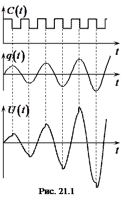 Как видно из этого примера, внешнее воздействие должно иметь удвоенную частоту и быть определенным образом согласовано по фазе, т. е. воздействие должно иметь резонансный характер, поэтому такой способ возбуждения колебания называется параметрическим резонансом. Для того чтобы возбудить параметрические колебания, совсем не обязательно сообщать конденсатору начальный заряд. Как уже отмечалось выше, в результате теплового движения в контуре постоянно имеют место флуктуации заряда, и периодическое внешнее воздействие будет усиливать те из них, которые имеют подходящие частоту и фазу. Простейшим примером механических параметрических колебаний являются качели. Изменяя положение центра масс системы (например, приседая и выпрямляя ноги) можно увеличить колебания качелей. Установившийся режим колебаний параметрического генератора обеспечивается за счет нелинейности его характеристик. Параметрические генераторы находят широкое применение в электротехнике, радиотехнике и оптике.