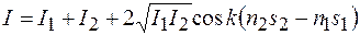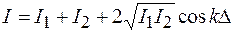 Полученное выражение показывает, что при наложении в точке наблюдения двух когерентных волн интенсивность в общем случае не равна сумме интенсивностей складываемых волн, а зависит от оптической разности хода этих волн до точки наблюдения. Явление наложения двух (или большего числа) когерентных волн, в результате которого происходит перераспределение интенсивности излучения в пространстве, называется интерференцией. Максимальная интенсивность будет, когда