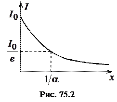 Полученная зависимость выражает закон Бугера, согласно которому интенсивность излучения в результате поглощения убывает по экспоненциальному закону (рис. 75.2). Из (75.2) следует, что если взять толщину слоя