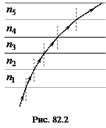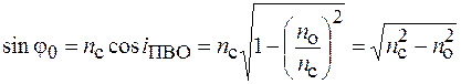 Излучение вводится в световод через торец. Рассмотрим луч, который после преломления на входном торце ступенчатого световода падает на границу раздела "сердцевина–оболочка" под углом полного внутреннего отражения (рис. 82.4). Для этого луча, считая, что световод находится в воздухе, по закону преломления имеем