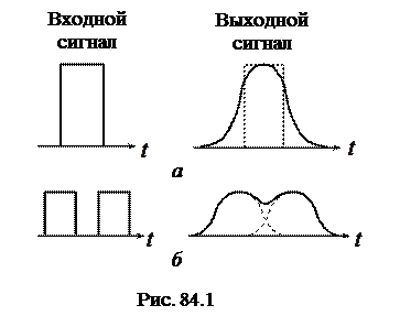 В оптических линиях связи широко используют кодово-импульсную модуляцию (КИМ). В этом случае информационный сигнал представляет собой последовательность импульсов, которая в закодированном виде содержит передаваемое сообщение. В результате дисперсии происходит уширение импульса (рис. 84.1, а). Если дисперсия велика, то два последовательных импульса могут перекрываться (рис. 84.1, б) и получатель сигнала примет их за один, а это означает искажение передаваемой информации. Для предотвращения ошибок следует увеличить интервал между соседними импульсами, т. е. уменьшить частоту следования импульсов (ширину полосы канала связи). Уменьшение частоты приведет к уменьшению количества информации, передаваемой в единицу времени, т. е. пропускной способности линии связи. Таким образом, явление дисперсии ограничивает ширину полосы и пропускную способность оптической линии связи. Для передачи больших потоков информации с высокой скоростью следует использовать волоконные световоды, которые обладают как можно меньшей дисперсией.