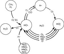 Подставив значения констант скоростей реакций, а также концентрации молекул воды (3,19·1017 см-3 при 25°С и относительной влажности 50%) и молекул атмосферных газов при давлении 1 атм (2,46·1019 см-3), получим отношение, равное 0,12. Еще некоторая часть атомов кислорода (около 8%) дезактивируется парами воды. Основными стоками гидроксильного радикала из атмосферы служат реакции с СО, СН4 и О3: СО + НО* ® Н* + СО2; СН4 + НО* ® СН3 + Н2О; О3 + НО* ® НО2* + О2 Исходя из этих уравнений, можно приблизительно вычислить концентрацию радикалов НО· в атмосфере Земли
