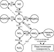 Рис. 7.2. Превращения водородсодержащих частиц в атмосфере Дополнительным источником, особенно важным для стратосферы, выступает реакция гидроксила с озоном. В тропосфере он может образовываться также в реакции: НО* + H2O2 ® НО2* + H2O Установлено, что радикал НО· активно окисляет монооксид азота: НО2* + NO ® NO2 + НО* Немногочисленные измерения указывают на примерно равномерное распределение гкдропероксидного радикала на высотах 5-30 км с концентрациями порядка 107-108 см 3. На рис. 7.2 приведена схема, отражающая основные связи и направления взаимных превращений водородсодержащих промежуточных частиц в земной атмосфере. Оксиды азота. Молекулы NО и NО2 – одни из немногих известных устойчивых соединений с нечетным числом электронов. Поскольку каждая из них имеет орбиталь, занятую лишь одним электроном, они являются свободными радикалами, стабилизированными сопряжениеми двойных связей. Моно- и диоксид азота играют важную роль в химии тропосферы и стратосферы. В нижней атмосфере им принадлежит видное место в контроле за содержанием радикалов гидроксила и, что особенно важно, озона. Из-за того что в воздухе обычно происходит довольно быстрое взаимное превращение NО и NO2 в научной литературе для их обозначения часто применяют символ NОх (NOх=NO+NO2). Поступление NОх в атмосферу в настоящее время в равной мере связано с природными (выделение NО почвами, образование NО и NО2 при грозовых разрядах и в химических реакциях возбужденных частиц в стратосфере) и антропогенными источниками. Антропогенная эмиссия NОх. обусловлена главным образом окислением N2, при сжигании ископаемого топлива и биомассы. Общий поток NО сейчас оценивается величиной (44 ± 10) Мт N/год, из них (24±5) Мт N/год поступает из антропогенных источников. Проведенные в различных регионах исследования показали, что концентрации NО в приземном воздухе изменяются от уровня, лежащего ниже предела обнаружения используемых методов анализа, до примерно 50 млрд - 1 (около 1,2·1012 см-3) в воздухе городов. Недавние измерения выявили сильную анизотропию широтного распределения монооксида азота в верхней тропосфере. В случае NО важным стоком становится взаимодействие с радикалом гидроксила: NO2 + НО* + M ® HNO3 + M* Образовавшаяся азотная кислота удаляется из атмосферы путем сухого осаждения, внутри- и подоблачного вымывания. Концентрации НNО3 и HNO2 в городском воздухе обычно не превосходят 5-10 млрд–1. Атмосферный озон окисляет NО2 с образованием радикальной частицы – триоксида азота NO2 + O3 ® NO3* + O2 В дневное время NО3 быстро разрушается путем фотолитического распада NO3* + hn ® NO + O2; NO3* + hn ® NO2 + O (Т) Поэтому триоксид азота играет заметную роль только в «ночной» химии тропосферы. Ночью концентрации NO3, над континентами лежат в пределах от примерно 5·107 до 1010 см-3. Для целей моделирования средние тропосферные концентрации в течение 12 ч «ночного» времени обычно принимают равными 2,4·108 см-3. Взаимные превращения азотсодержащих частиц в атмосфере приведены на схеме (рис. 7.3).
