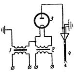 Рисунок 23 - Принципиальная схема испытания кабеля: 1 – повысительный трансформатор; 2 – трансформатор накала; 3 – кенотрон; 4 – испытуемый кабель