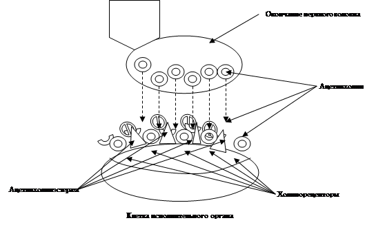 Рис. 6 При поступлении нервного импульса из окончания холинергического нервного волокна начинает выделяться медиатор ацетилхолин, который взаимодействует с холинорецепторами на мембране клетки исполнительного органа или вегетативного ганглия. Таким образом, происходит передача возбуждения с нервного волокна на клетку, которая начинает осуществлять свои функции. После этого ацетилхолин разрушается на мембране клетки ферментом холинэстеразой, и передача нервного импульса прекращается. Классификация холинотропных средств. I. Холинопозитивные средства – имитируют эффекты ацетилхолина в организме. 1. Прямого типа действия (холиномиметики) – непосредственно стимулируют холинорецепторы. а) М-холиномиметики; б) Н-холиномиметики; в) М,Н-холиномиметики. 2. Непрямого типа действия (антихолинэстеразные средства) – блокируют фермент холинэстеразу и т.о. усиливают и удлиняют эффекты ацетилхолина. II. Холинонегативные средства – препятствуют возбуждению холинорецепторов ацетилхолином. 1. М-холиноблокаторы (М-холинолитики); 2. Н-холиноблокаторы: а) ганглиоблокаторы; б) миорелаксанты.